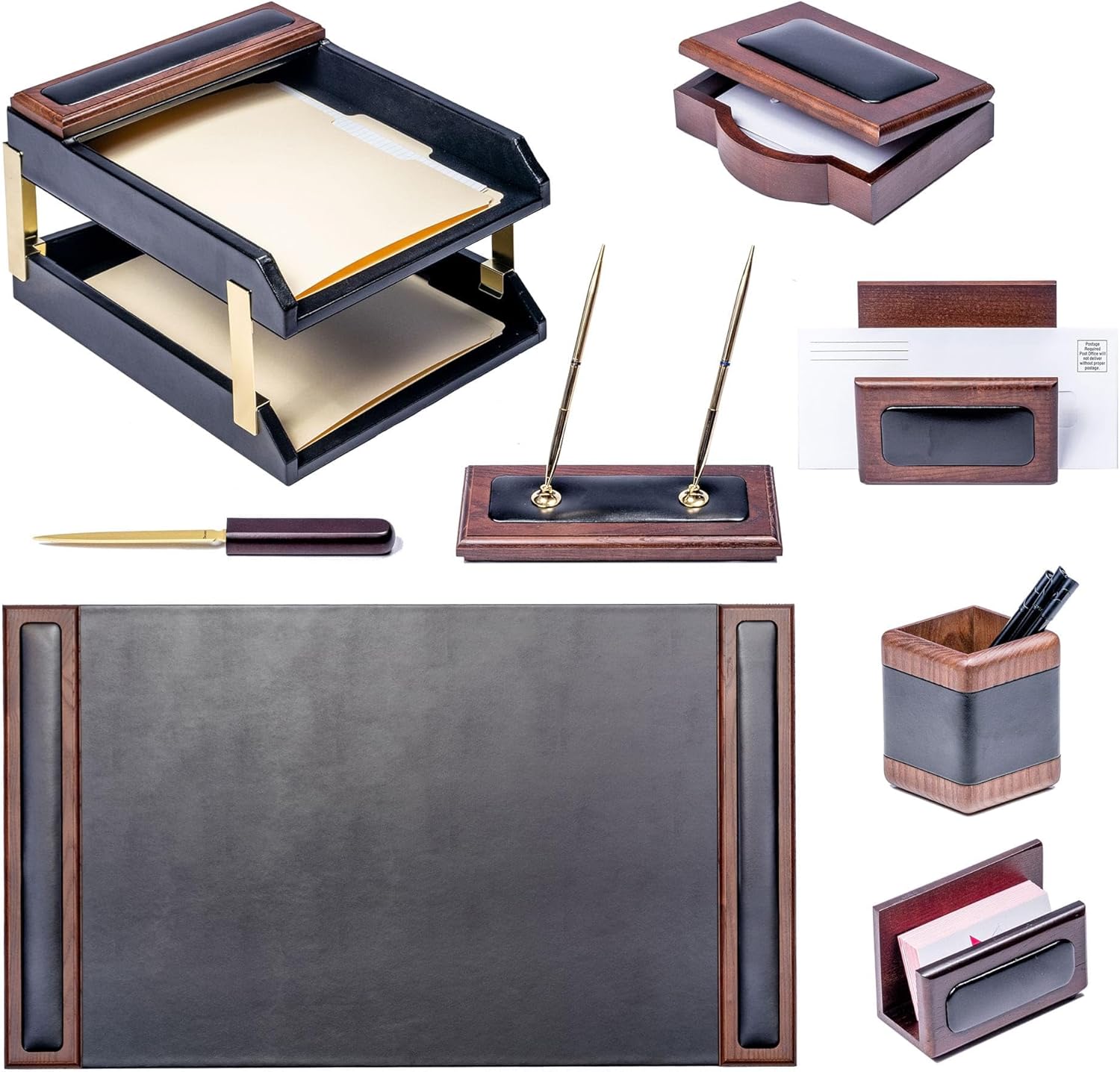 - CONTENTS: This leather desk organizer set includes a 34" x 20" side-rail desk pad, two front-load letter-size tray, a pencil cup, a 4" x 6" memo holder, a business card holder, a letter holder, a letter opener, a double pen stand and stacking tray posts.