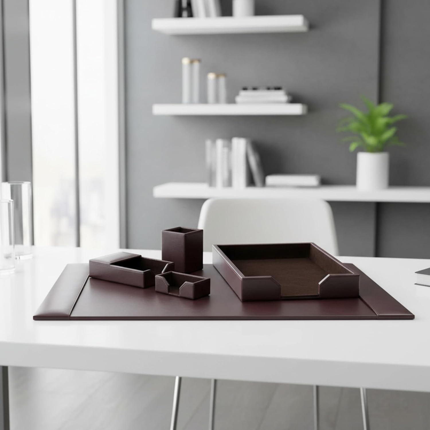 - LUXURY WITHOUT THE PRICETAG: All components of this set are made with beautiful bonded leather, allowing you the elegance of a leather office desk set without breaking the bank. From the soft, supple surface to the fine stitching and precise edges, each handcrafted piece is created with the utmost care and attention to detail.