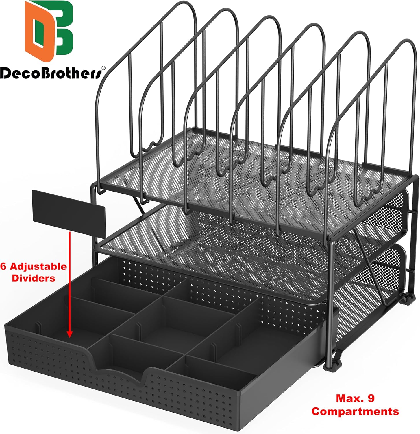 DecoBros Mesh Desk Organizer with Double Tray, 5 Upright Sections and Sliding Drawer, Black