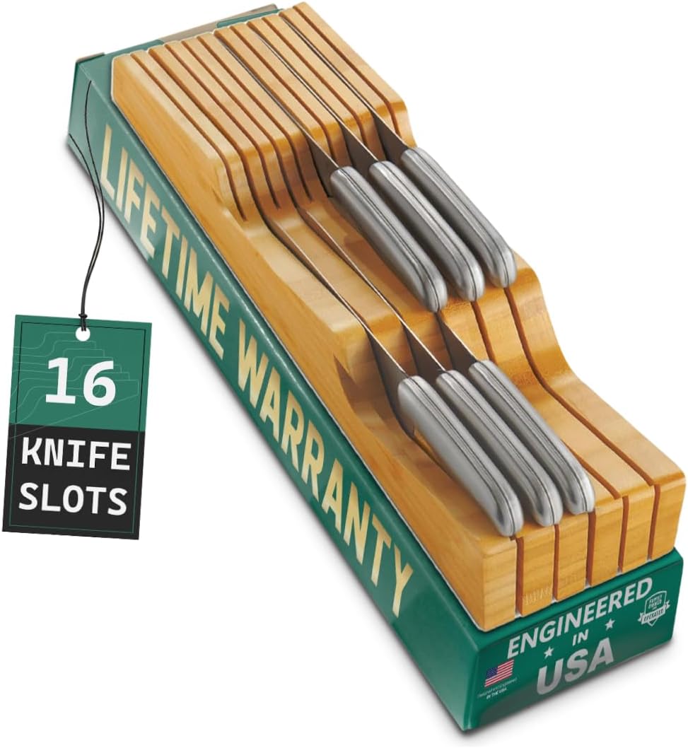 - CLEARS UP COUNTER SPACE - EXCELLENT FOR SMALLER KITCHENS: Small kitchens are more organized with in-drawer knife blocks that free up counter space. Measures 17” long x 5.29” wide x 2” high.