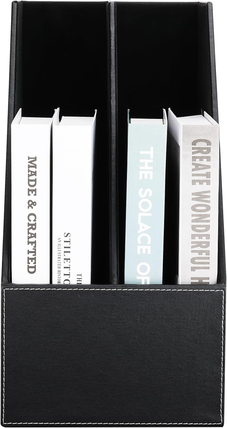 KINGFOM Wooden Leatherette Desktop File Folder Organizer and Document File Stand Journals Magazine Rack 2 Slots (black)