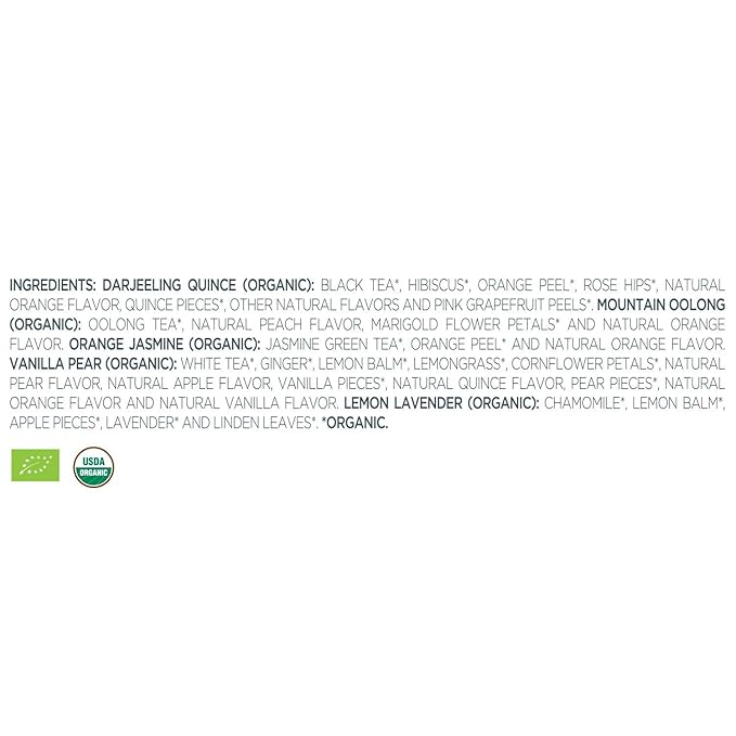 - LOTUS COLLECTION, curated assortment of 5 relaxing hot teas for mind, body & spirit; unique, unprecedented gourmet collection of certified organic teas: Vanilla Pear, Orange Jasmine, Mountain Oolong, Darjeeling Quince, Lemon Lavender