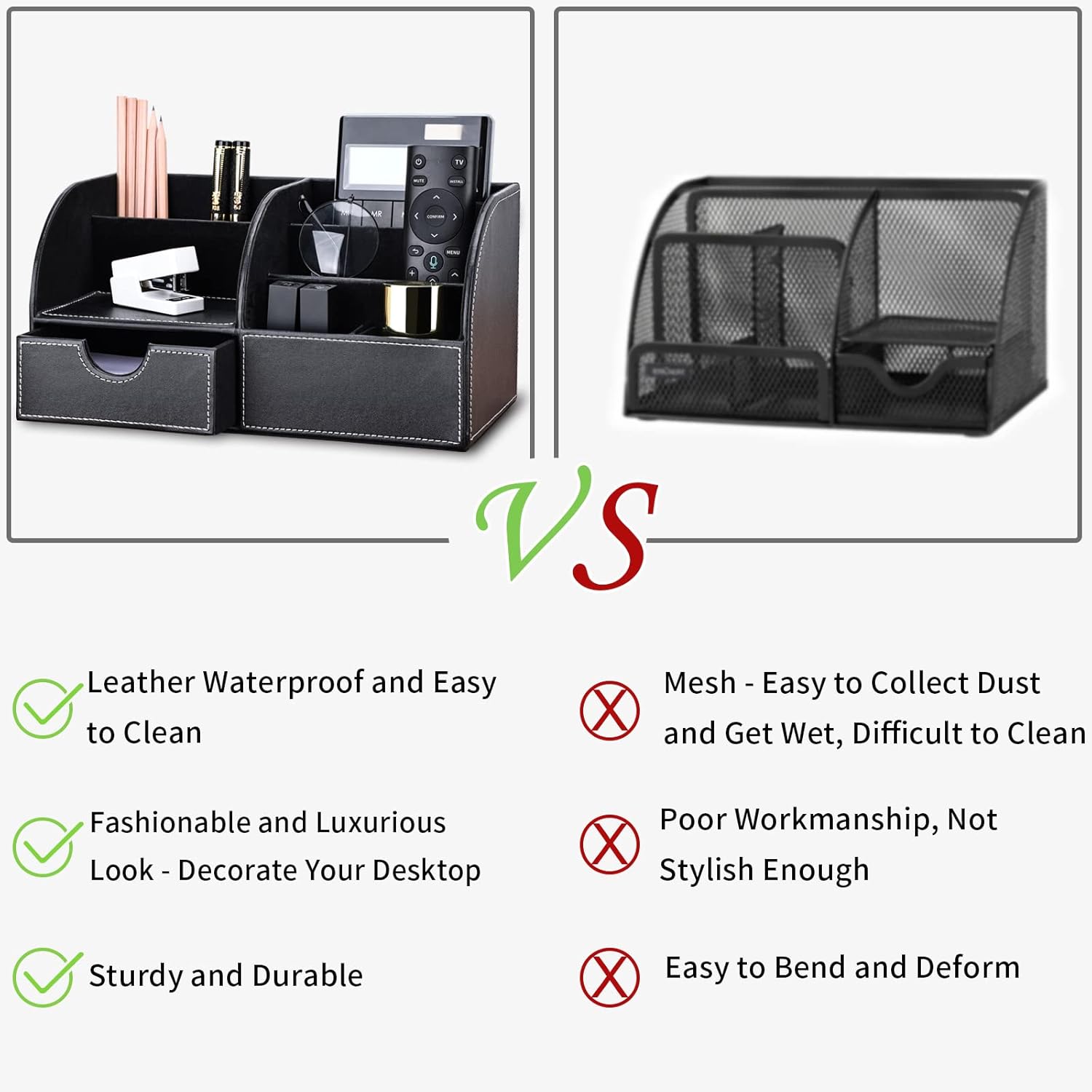- ▶ STYLISH DESIGN AND STURDY CONSTRUCTION: The desk organizer surface is made of high quality PU leather with MDF struction, and designed with stitched detailing.