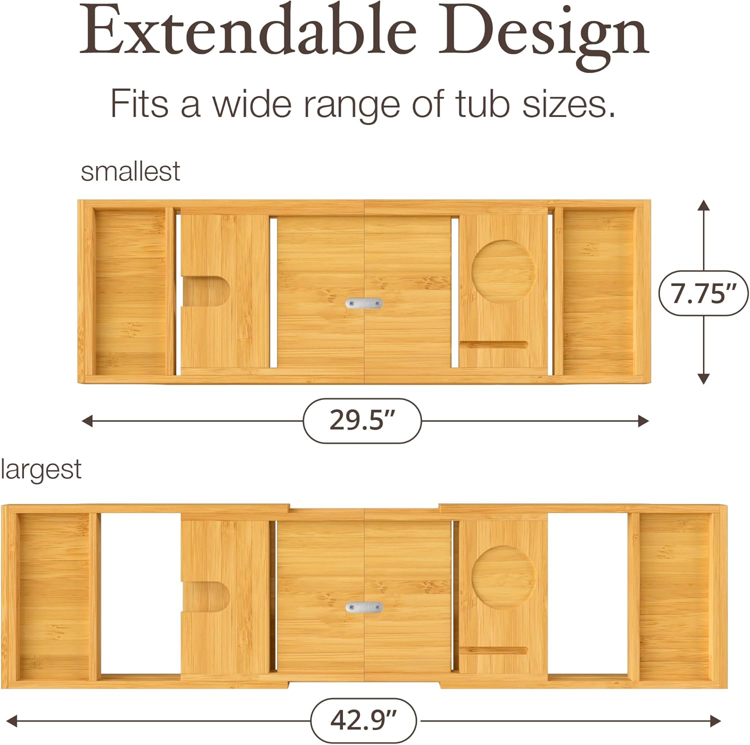 - Adjustable to Fit Most Tubs - The bath caddy tray for bathtub extends from 29.5” to 42.9” to fit nearly all tub sizes. No tools required—simply slide to adjust and enjoy the perfect tub tray for bathtub setup.
