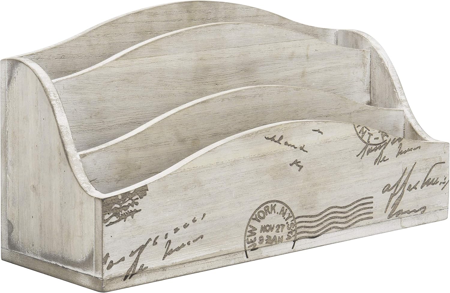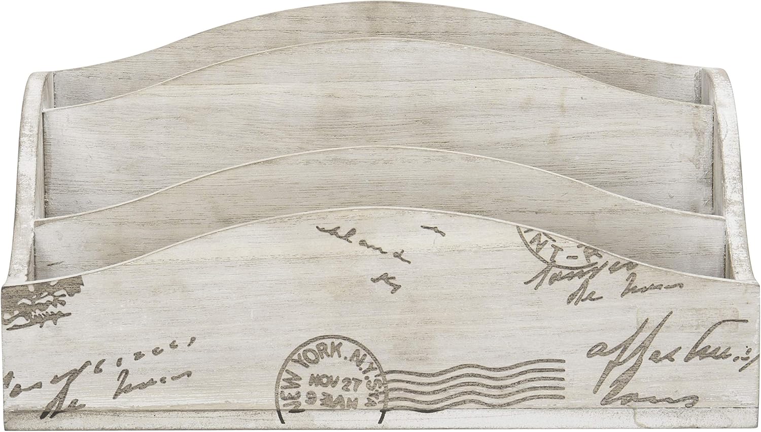 - 12-inch beige wooden office desk workspace organizer features a 3-slot bin for sorting mail, documents, or magazines, displays a weathered postcard design