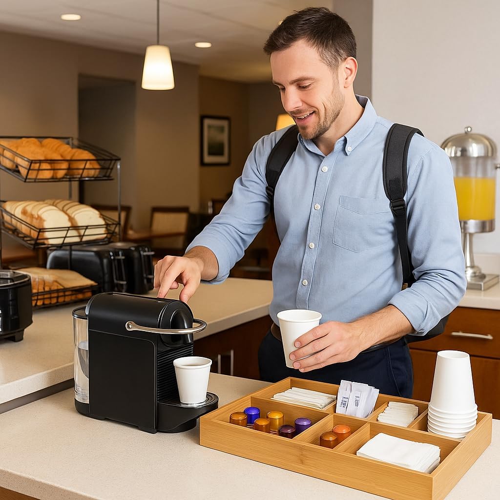 - Spacious & Organized Design – Features multiple compartments to neatly store coffee and tea essentials such as pods, sugar, stirrers, napkins, and creamers.