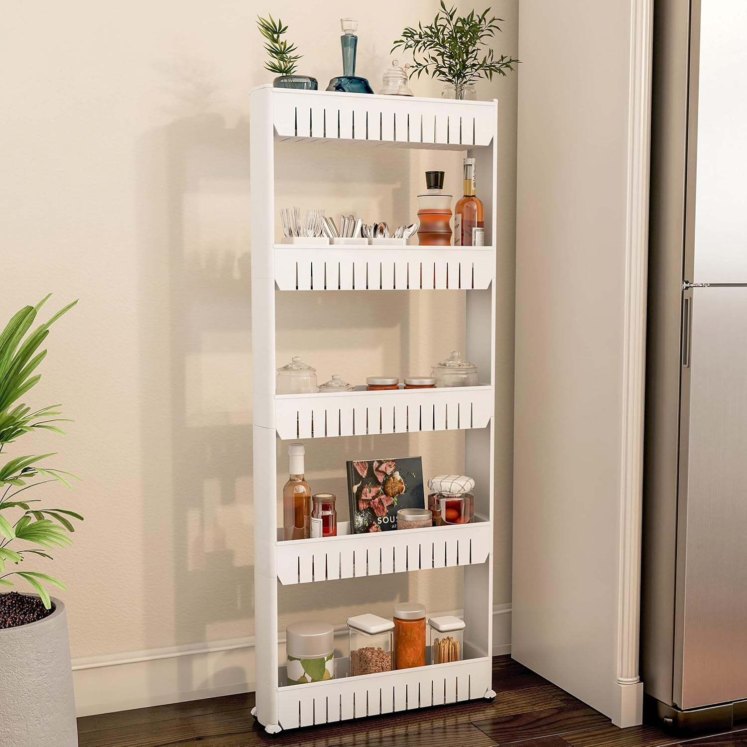 - MOBILE CONVENIENCE - PVC wheels on the base make these kitchen shelves roll forward for easy access and back into place when you finish your task. The mobile convenience enables hassle-free movement of this 5-tier bathroom organizer between rooms.