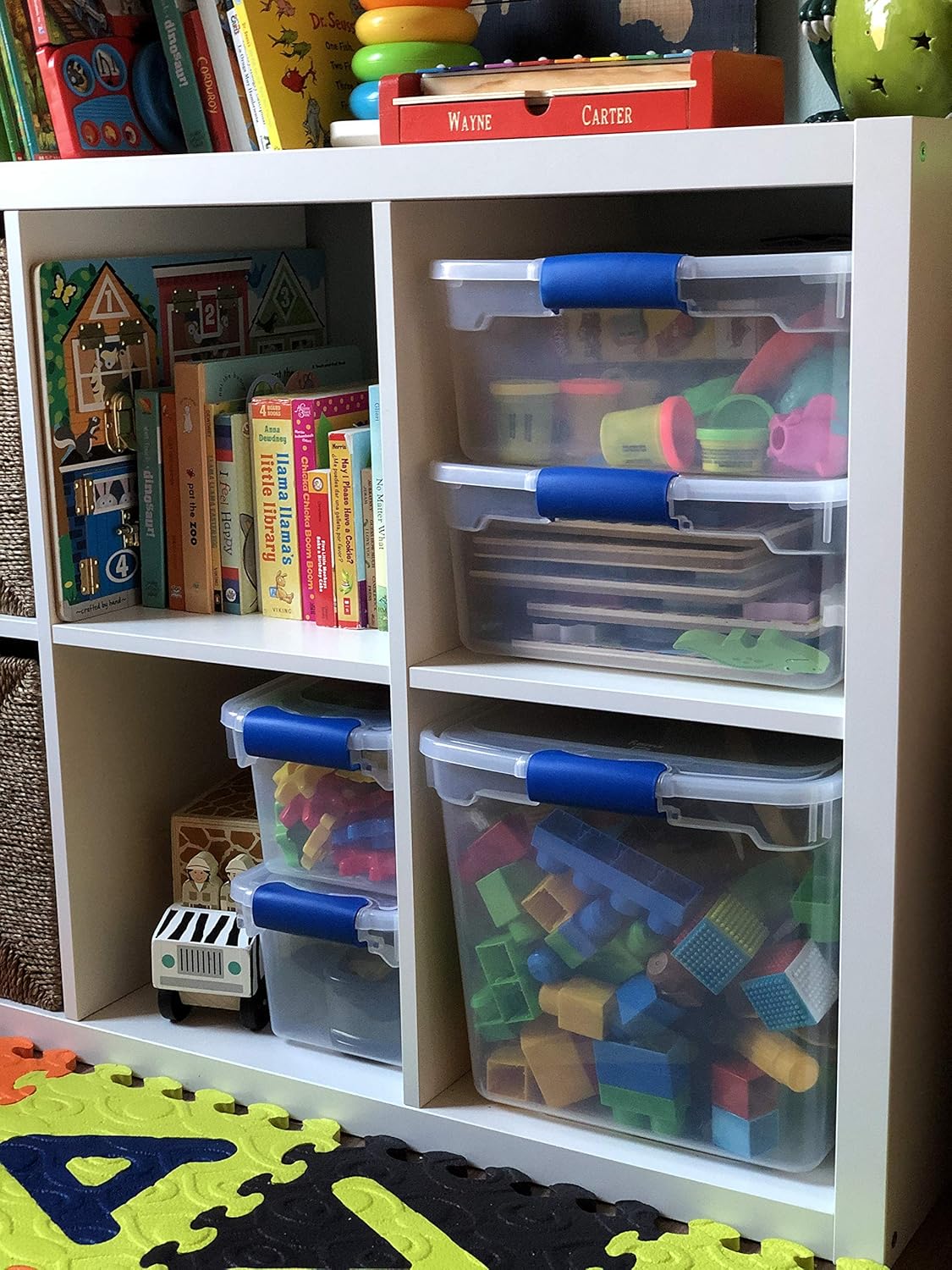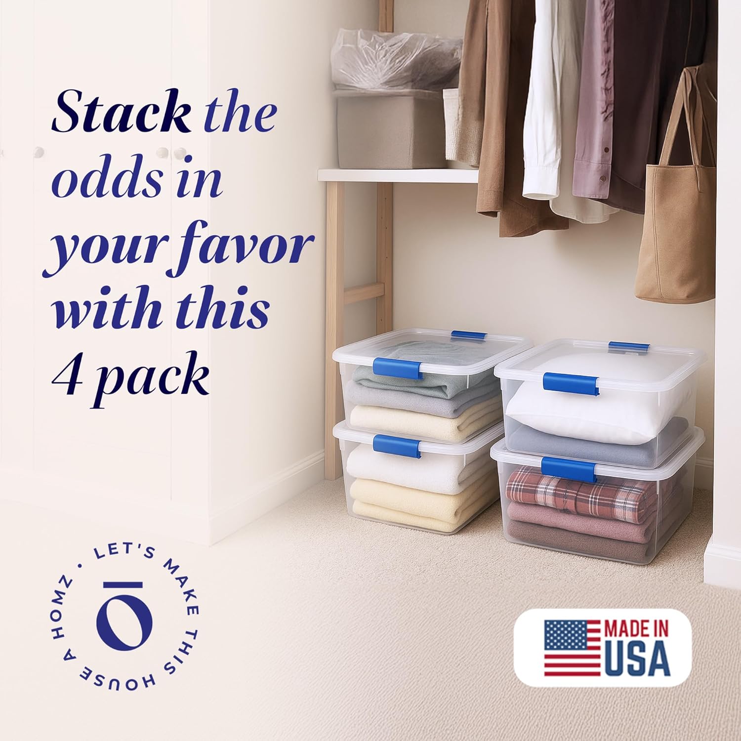 HOMZ 4-Pack Latching Lid, Small Clear Plastic Storage Bins w/ Lids, 15.5 Quart, Blue Latch - Stackable Container Boxes for Home, Bathroom, and Office Organization