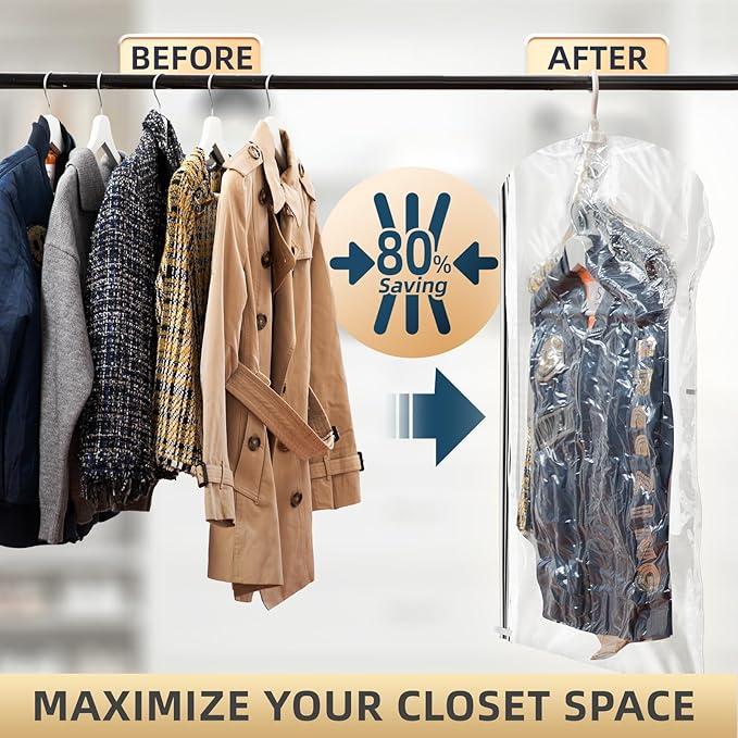 - Maximize Your Closet Space: Size of Vacuum Storage Bags: 2 Long( 53x27.6 in)+ 2 Short( 41.3x27.6 in). Store up to 5 pieces of clothing, including jackets, suits, and coats in one hanging vacuum bag and reduce its original size, making more room in your wardrobe for new pieces