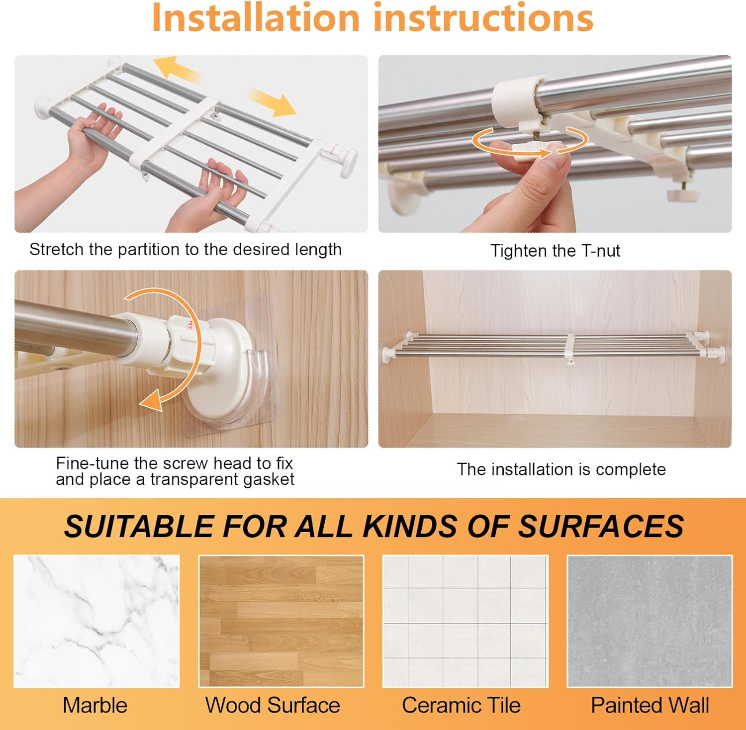 - ❀ Easy to install: No tools needed, no damage to your decorative wall, adjustment to the length you want within the expandable range, just select strong sides ,such as tiles, walls, wardrobes, shoe racks, cabinets, refrigerator, bookcase compartment.