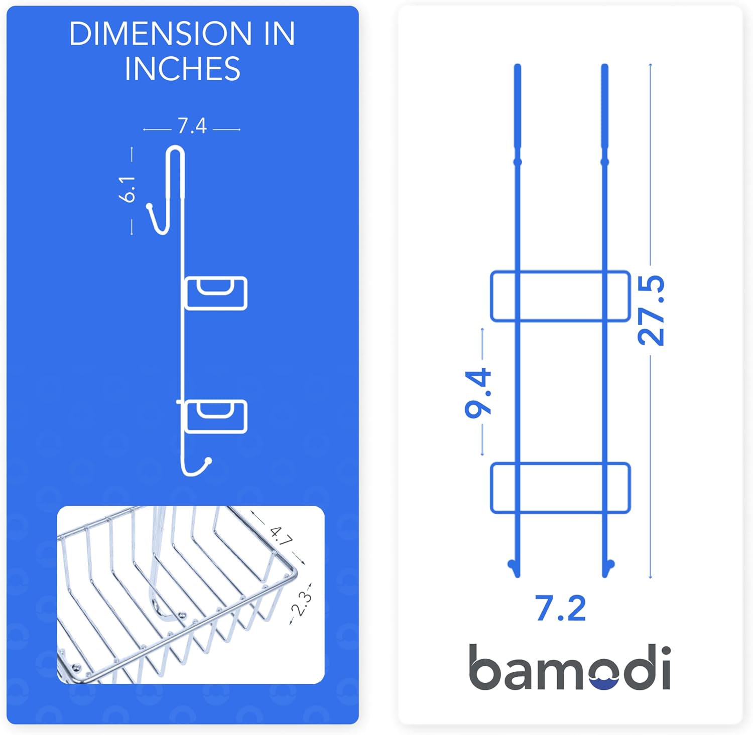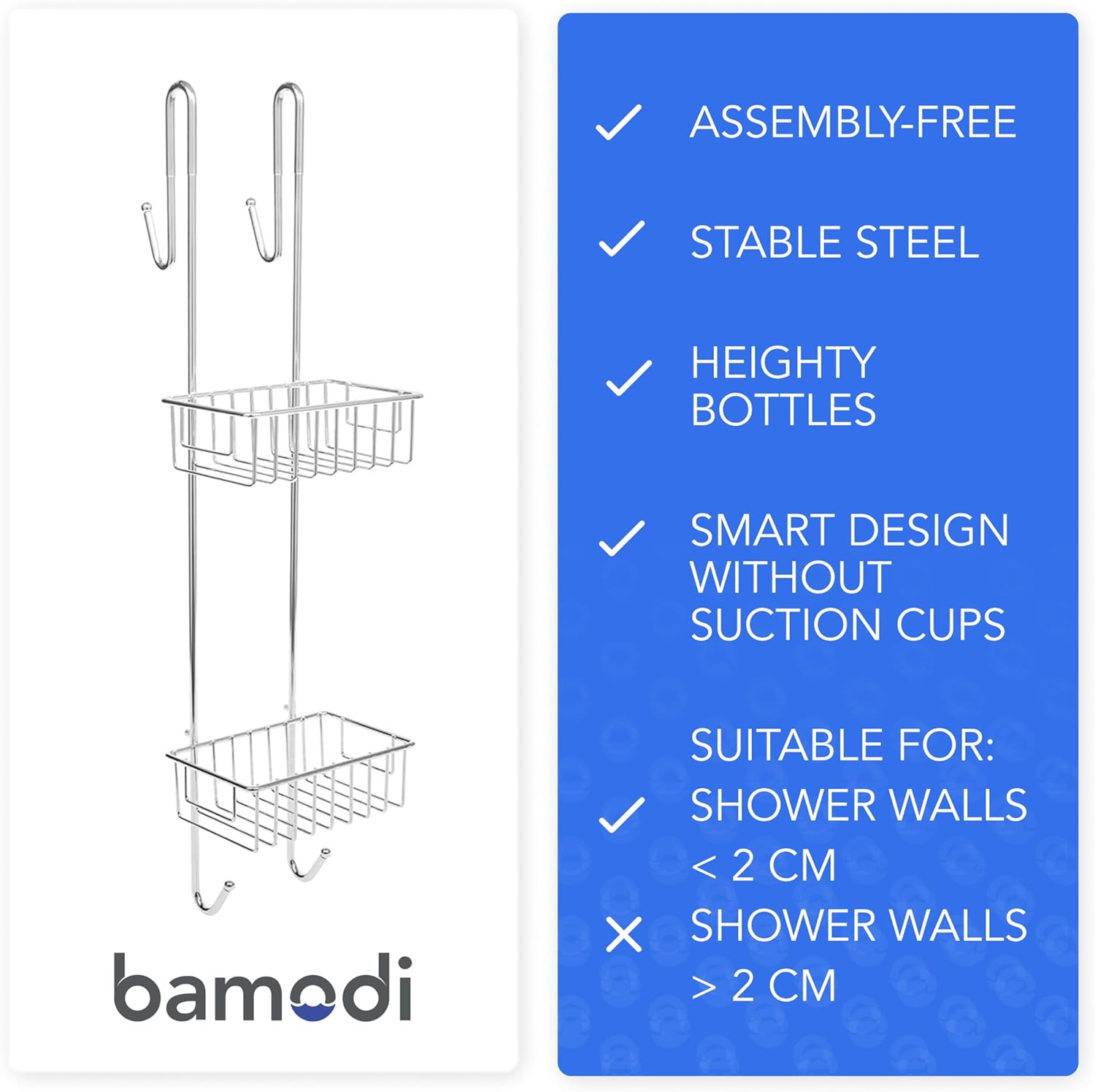 Bamodi Shower Caddy Hanging - 2 Tier Over Door Chrome Plated - No Drilling Required - Fits Shower Screens up to 0.78 inches - Hangable Shower Rack with 2 Towel Hooks (27.5 x 7.5 x 7.3 INCHES)