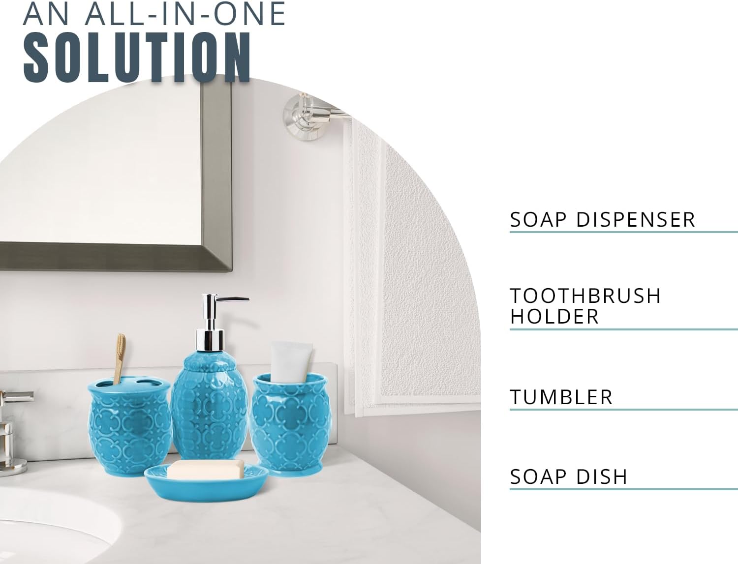 - Durable Ceramic Set: Includes a dispenser, toothbrush holder, tumbler, and soap dish—crafted from ceramic to handle everyday use while helping keep your countertop neat and organized.