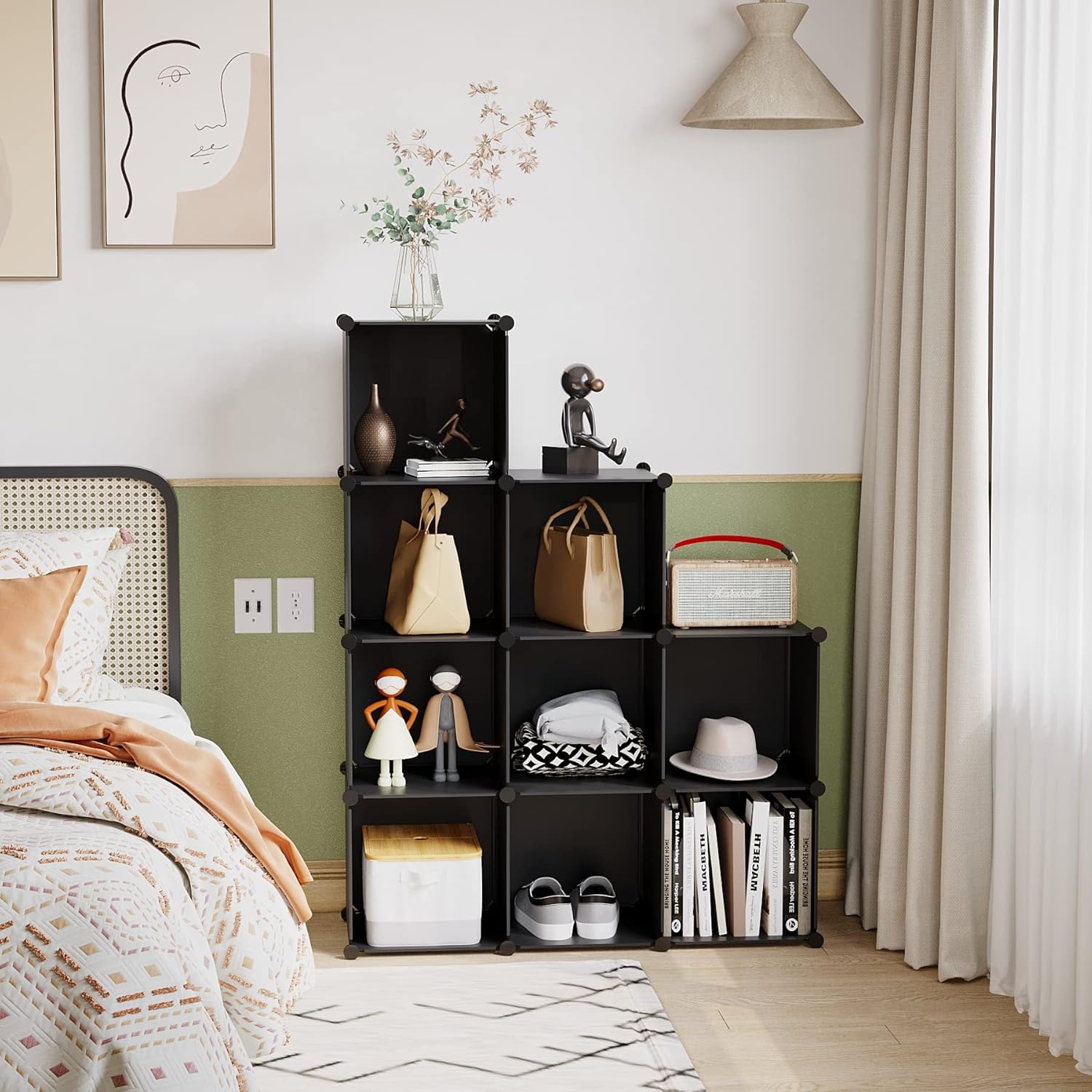 C&AHOME Cube Storage, 9-Cube Bookshelf, Plastic Closet Cabinet Organizer, DIY Stackable Bookcase, Modular Shelving Units Ideal for Home, Office, Kids Room, 36.6" L x 12.4" W x 48.4" H Black SHS3009A