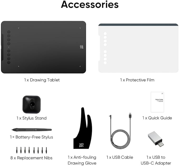 - What You Get: 1 x Deco 01 V3 Drawing Tablet, 1 x Stylus, 10 x Nibs, 1 x Stylus Stand, 1 x Glove, 1 x Protective Film, 1 x USB-C to USB-A Cable, 1 x USB to USB-C Adapter