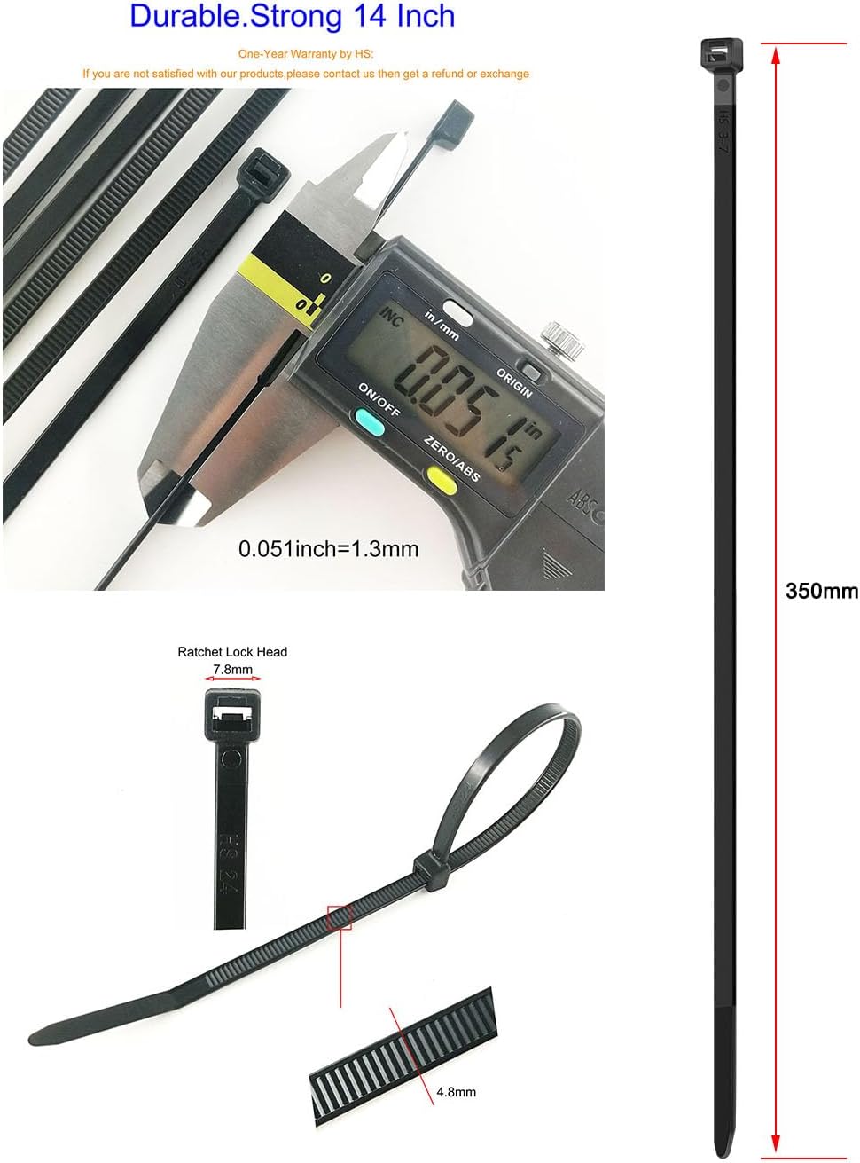 - Length:350mm(13 3/4”),width:4.8mm(3/16”),max bundle diameter:3.54”
