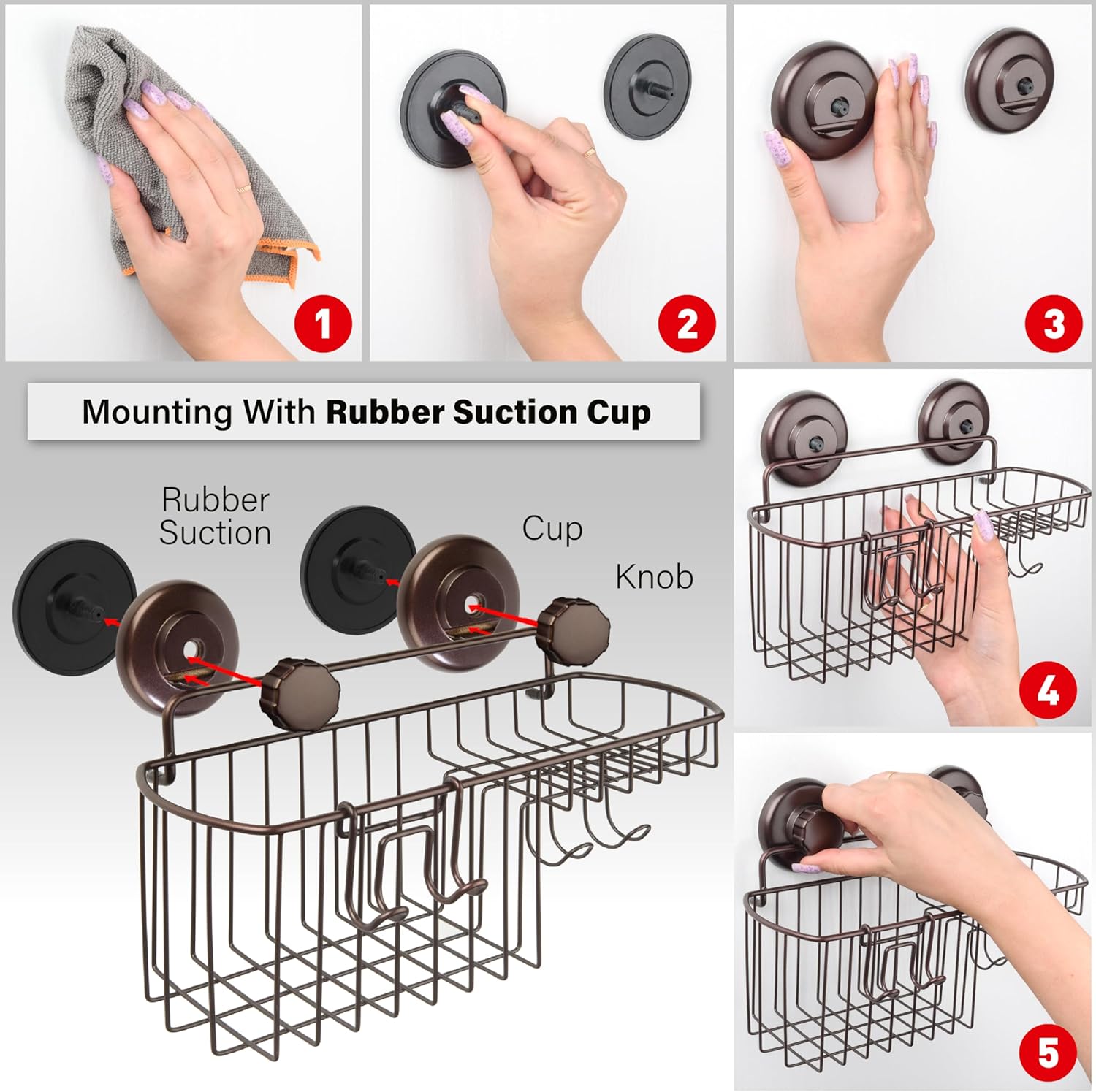 - NO TOOLS, NO DRILLING, NO SCREWS, NO HOLES: With the suction cup technology, it becomes extremely easy to install suction shower caddy: simply position on a smooth surface, apply pressure and turn clockwise.