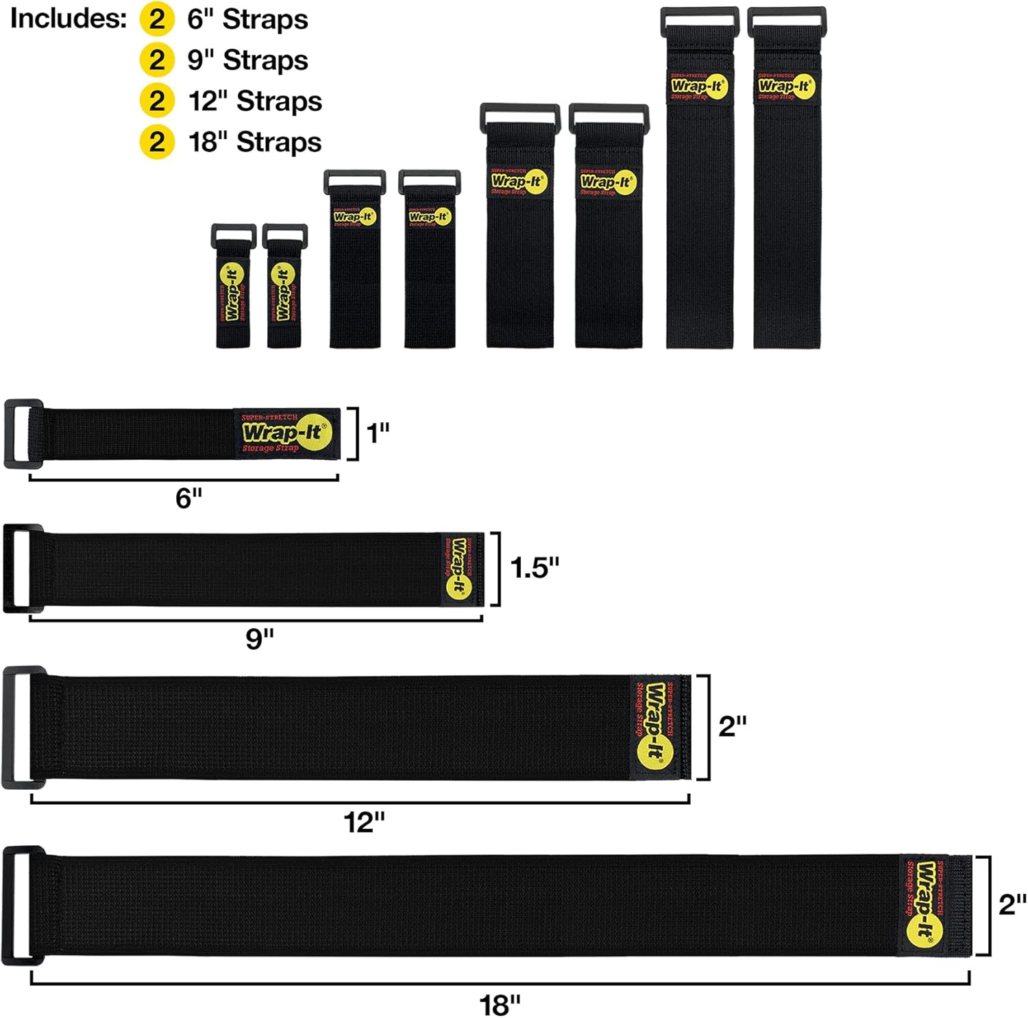 - INCLUDES: (2) 6-inch, (2) 9-inch, (2) 12-inch, and (2) 18-inch elastic cinch straps from Wrap-It Storage. A great stocking stuffer for men who have everything!