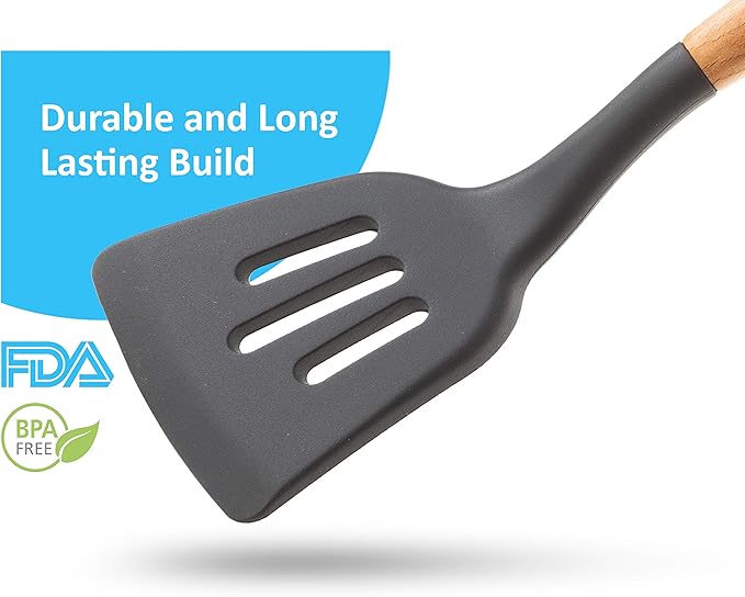 - STYLISH DESIGN: These cooking utensils have a modern design that will match every kitchen decoration and style. The silicone kitchen tools come in elegant Dark gray and natural wood so they can be perfect for every style, from rustic and romantic to minimalist and modern
