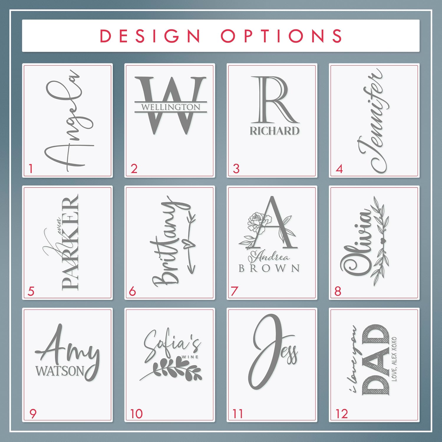 - UNIQUELY CUSTOMIZED: By providing 12 elegant designs, we give you a chance to create your own unique tumbler by adding personal customization details such as a name, last name, title, or text. Once you click the "CUSTOMIZE NOW" button, you will be able to add your customization info related to the design you choose.