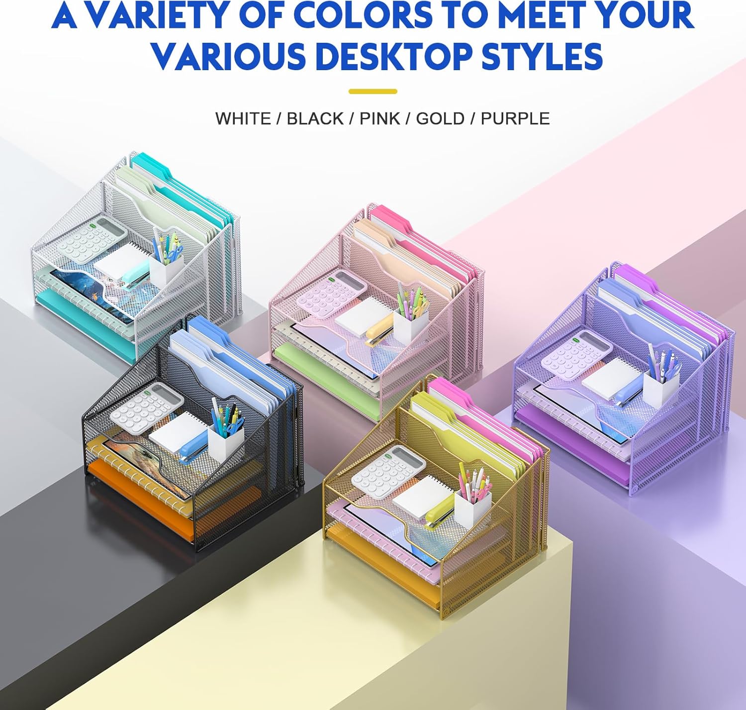 Samstar Desk File Organizer, Mesh Letter File Folder Holder with 3 Paper Trays and 2 Vertical Upright Section, for Office Supplies,Desk Accessories & Workspace,Black.