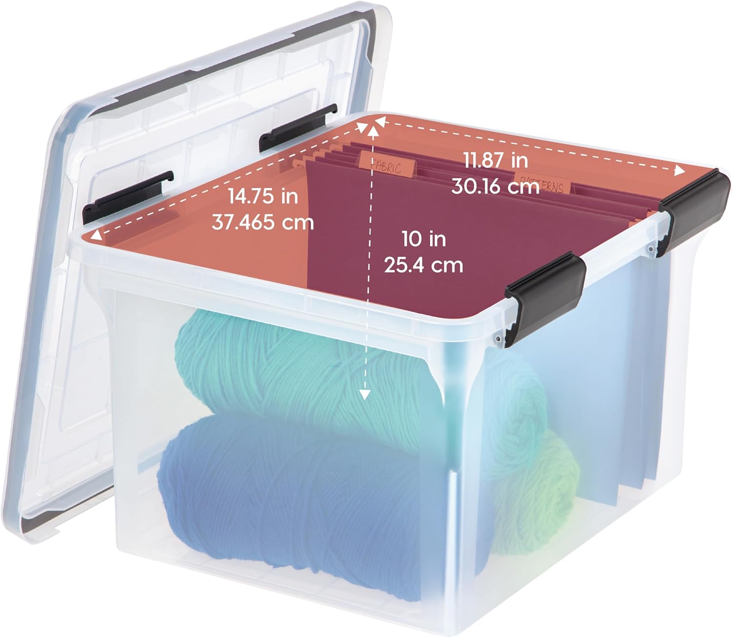 IRIS USA File Box WeatherPro File Organizer Plastic File Box for Letter/Legal File, Water Resistant Document Box, Durable Lid, Seal w/Secure Latching Buckles, Stackable, Nestable, Clear 32 Qt. 4Pack