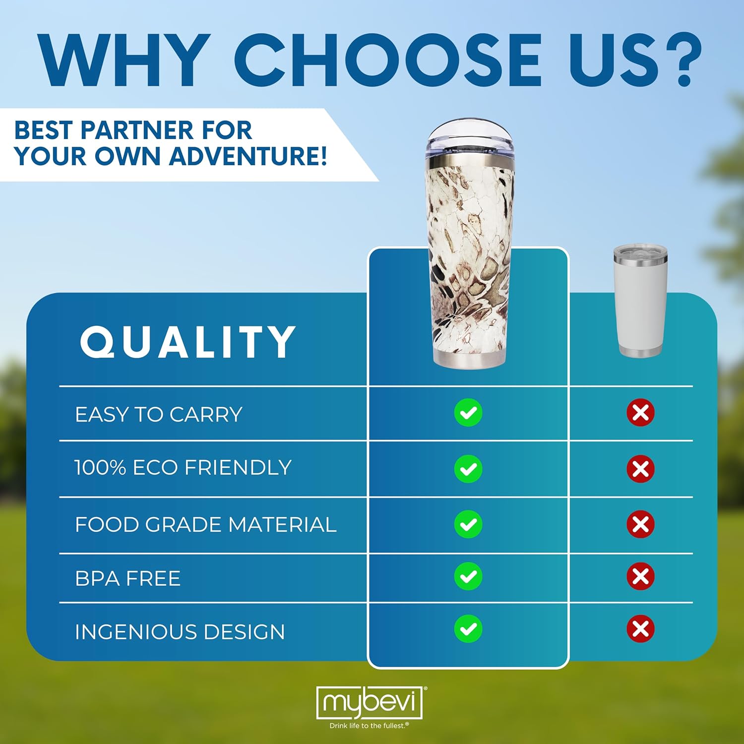 - BPA-Free and Environmentally Friendly: Protect the environment, your health, and your taste buds. Our travel mug are completely free of harmful BPAs, ensuring a pure and untainted drinking experience. Whether it's for work, leisure, or fitness, trust in MyBevi for a premium-grade, eco-conscious insulated tumblers.