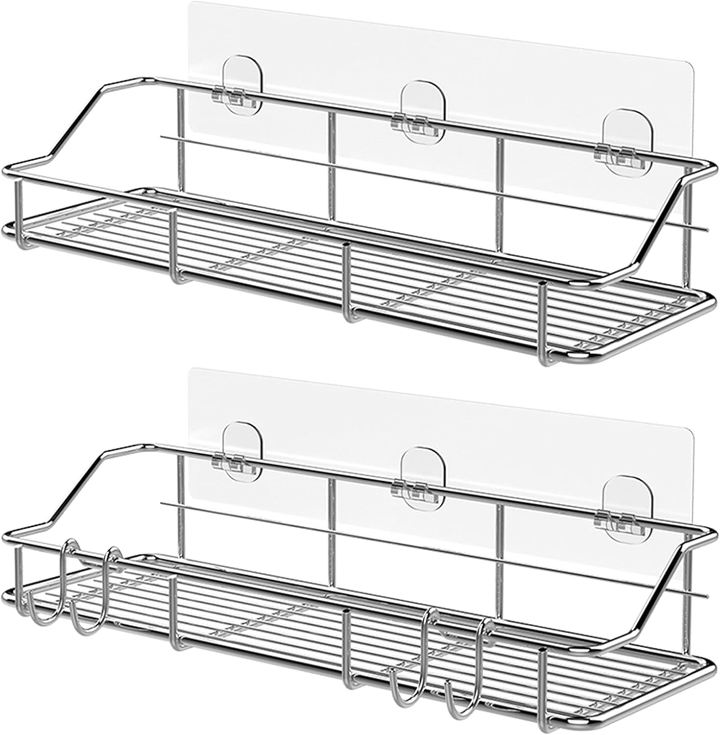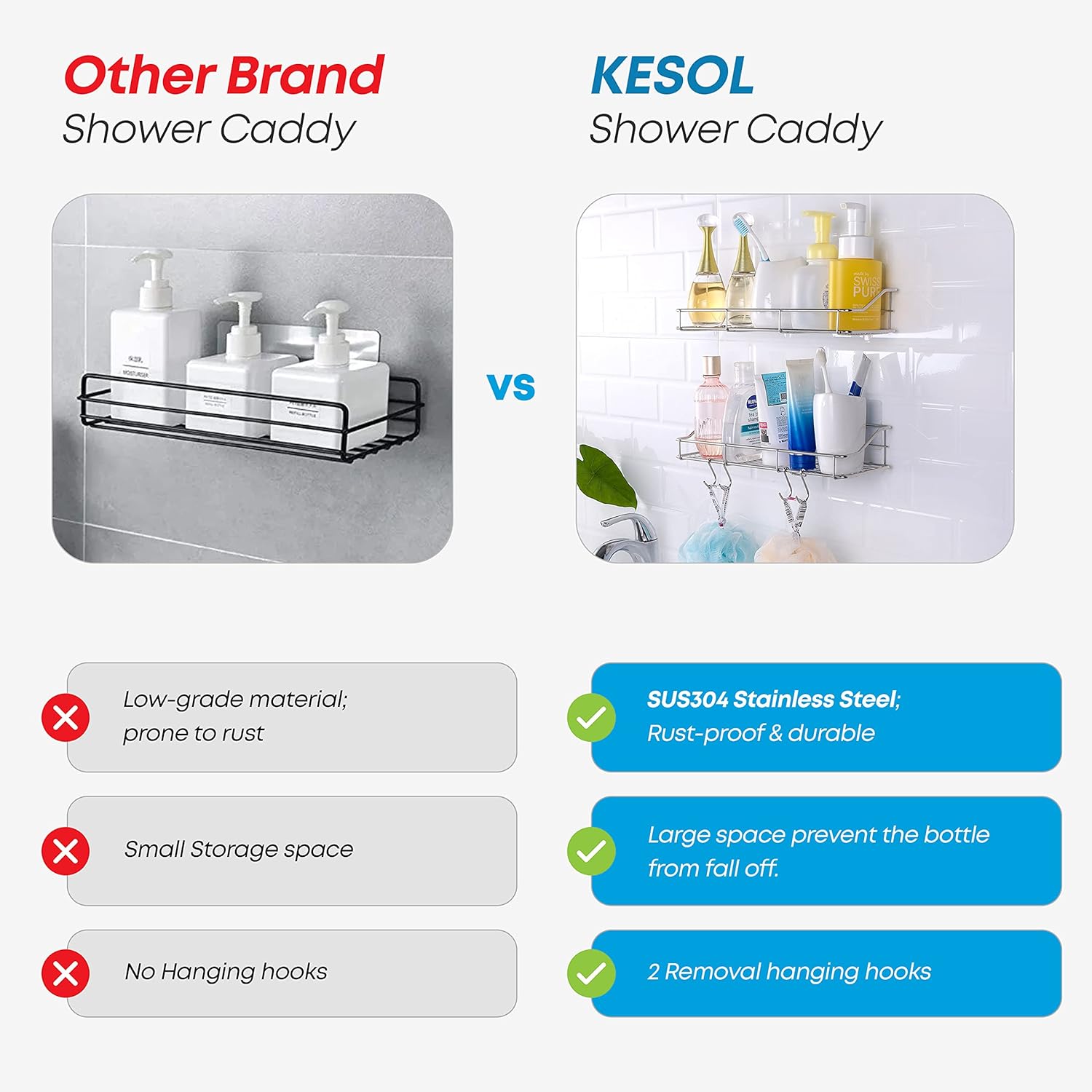 KESOL Adhesive Shower Caddy Shower Shelf Organizer for Bathroom Organization with Hooks, SUS304 Stainless Steel, 2 Pack (Silver)