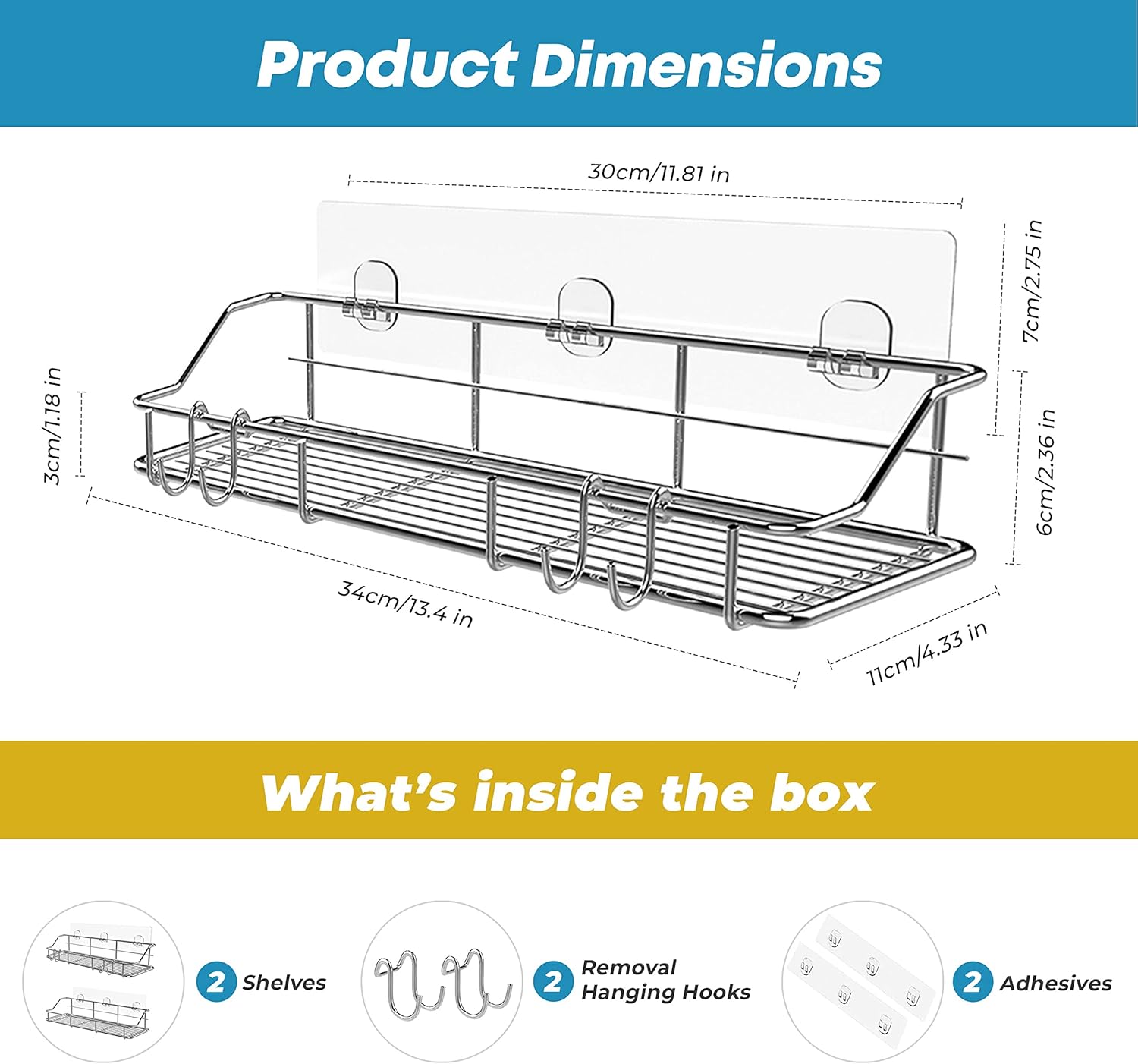 - NO DRILL STRONG ADHESIVE SHELF: Easy-peasy install. Just peel off the cover and install. 3 Powerful transparent adhesive hooks are durable and stronger than suction cup. Tested to hold 30 lbs in daily use.