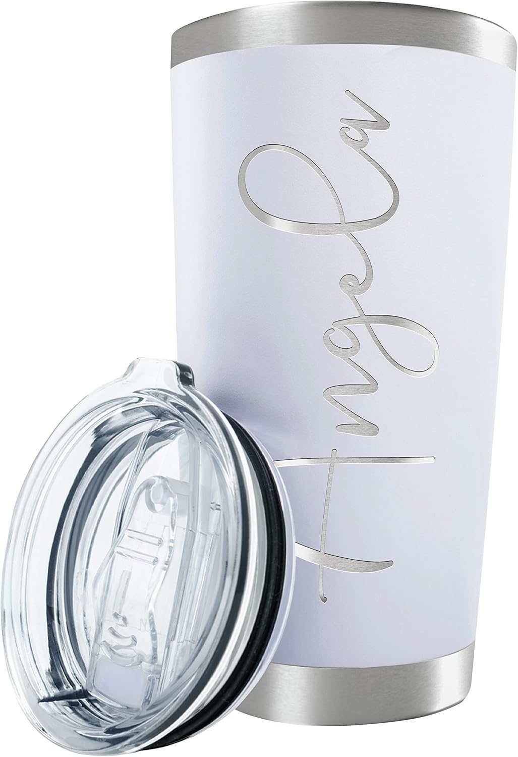 Personalized Tumbler with Engraved Name - 12 Designs, 20 Oz Coffee Tumbler with Slider Lid, White, Double Wall Insulated - Custom Gifts for Women