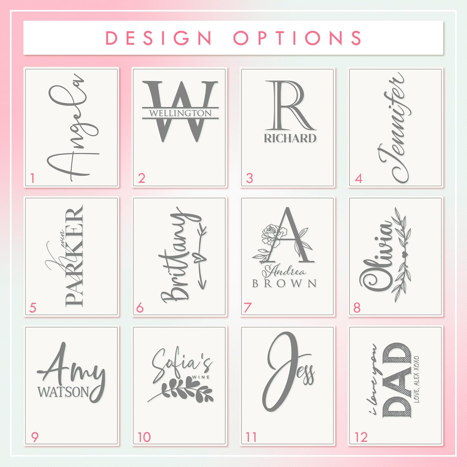 - UNIQUELY CUSTOMIZED: By providing 12 elegant designs, we give you a chance to create your own unique tumbler by adding personal customization details such as a name, last name, title, or text. Once you click the "CUSTOMIZE NOW" button, you will be able to add your customization info related to the design you choose.