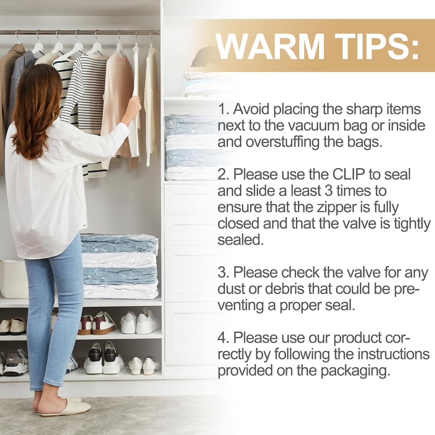 - Meets Different Requirements: Our bags are made of strong material to meet various purpose such as bedroom storage, moving storage, college dorm room essentials storage closet organizers and storage. It will be more convenient to seal the space saver vacuum storage bags by using the clip in the bags