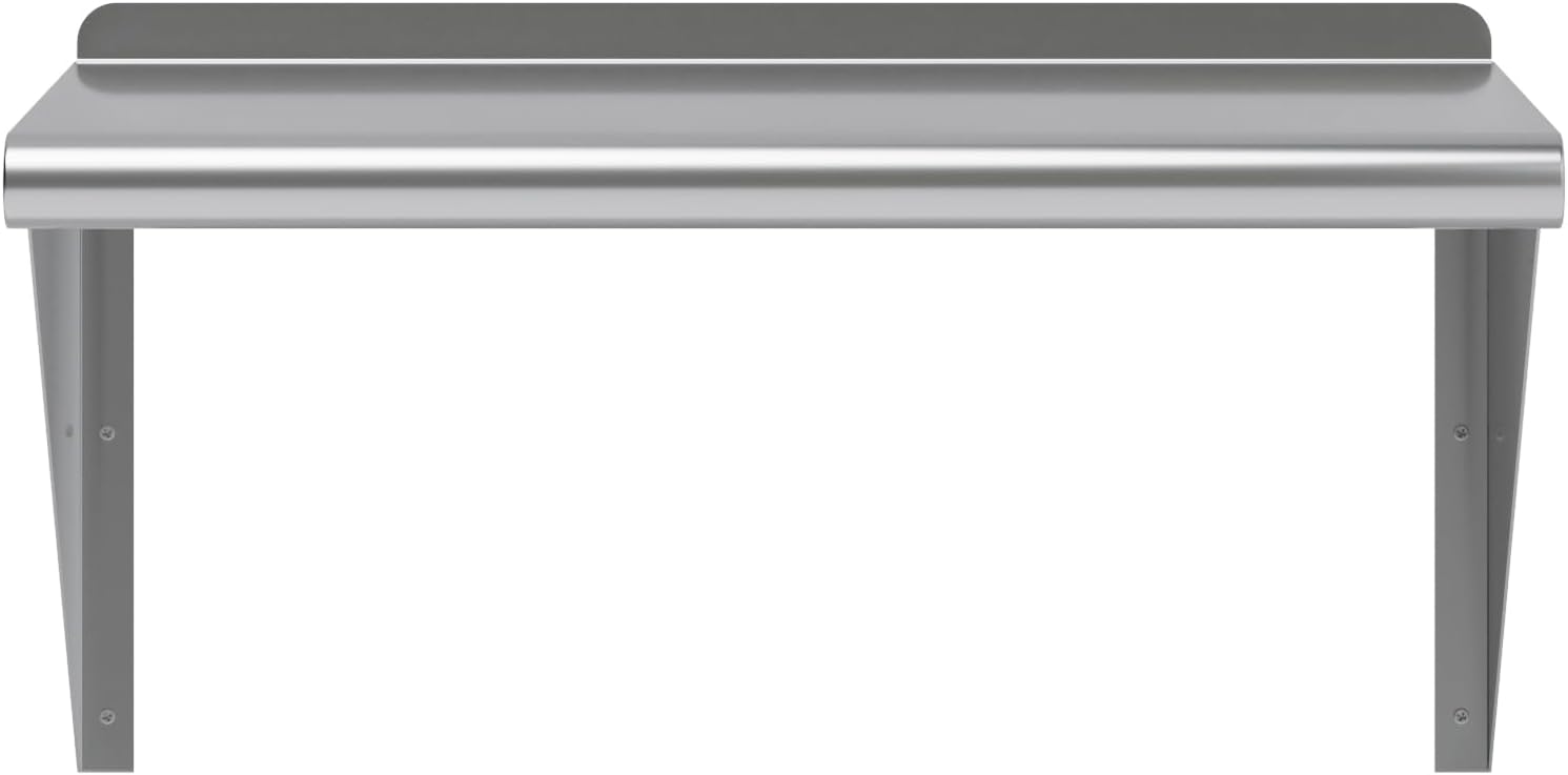 - 14 in. x 24 in. Stainless Steel Wall Shelf with 12 in. High Mounting Brackets. This heavy-duty multifunctional stainless wall shelf is made with 18 gauge stainless steel and can hold up to 240 Lbs of weight. The design features a 1 in. backsplash and bullnose edge. It's made with durable welded corners and support brackets.