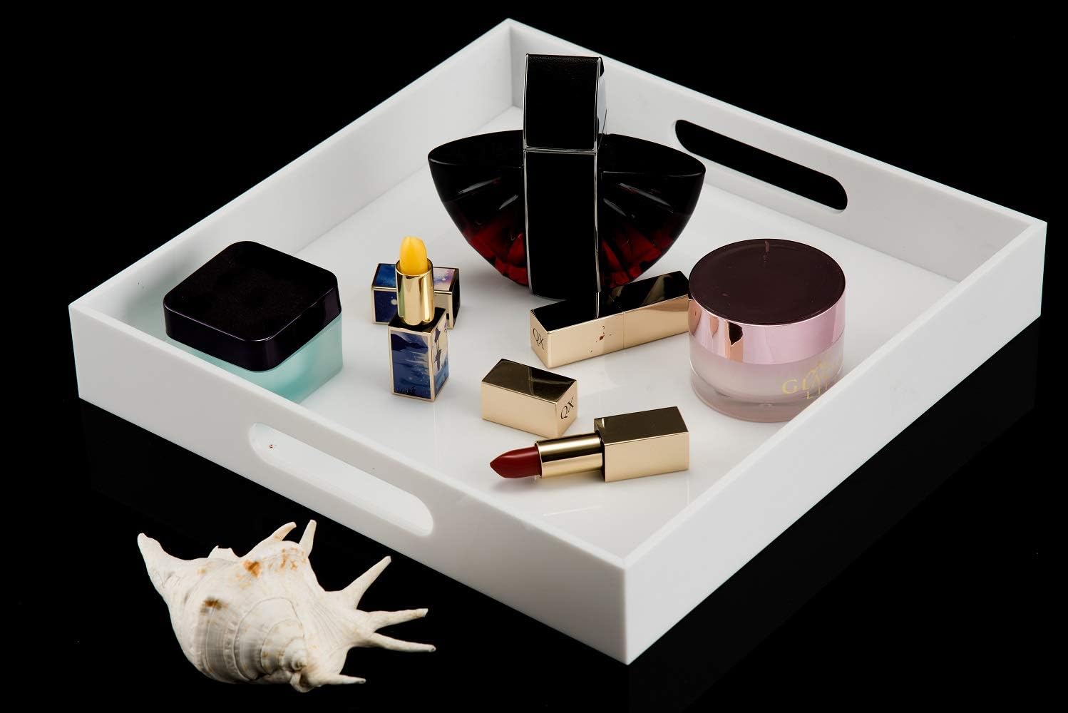 Glossy White Sturdy Acrylic Serving Tray with Handles-12x12Inch-Serving Coffee,Appetizer,Breakfast,Butler-Kitchen Countertop -Cosmetics Organizer-Vanity Table Tray-Ottoman Tray-Decorative