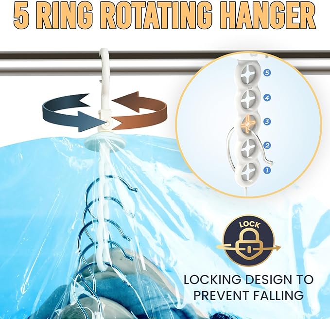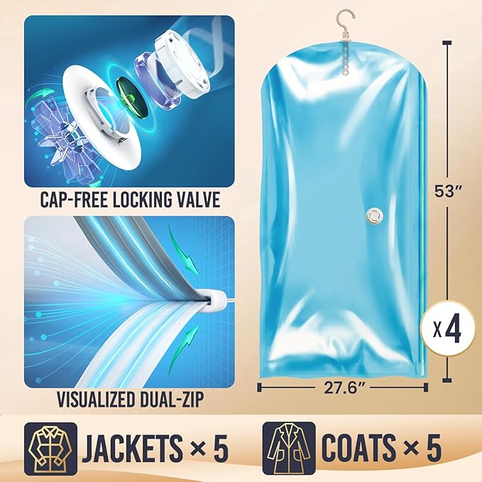 - Closet Storage and Organization: Save more Wardrobe space, with our hanging vacuum bags(2 Long( 53x27.5 in)+ 2 Short( 43x27.5 in)), you can hang up to 5 pieces of clothing, including jackets, suits, and coats