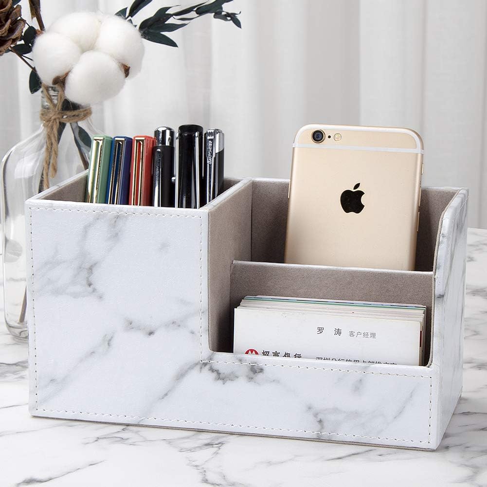 KINGFOM Desk Organizer Office Supplies Caddy Pu Leather Multi-function Storage Box Pen/Pencil,Cell phone, Business Name Cards Remote Control Holder Gray Marble