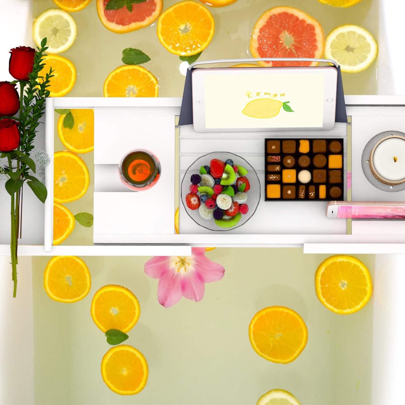 Bathtub Caddy Tray for Luxury Bath - Bamboo Waterproof Expandable Bath Table Over Tub with Wine and Book Holder and Free Soap Dish (White)