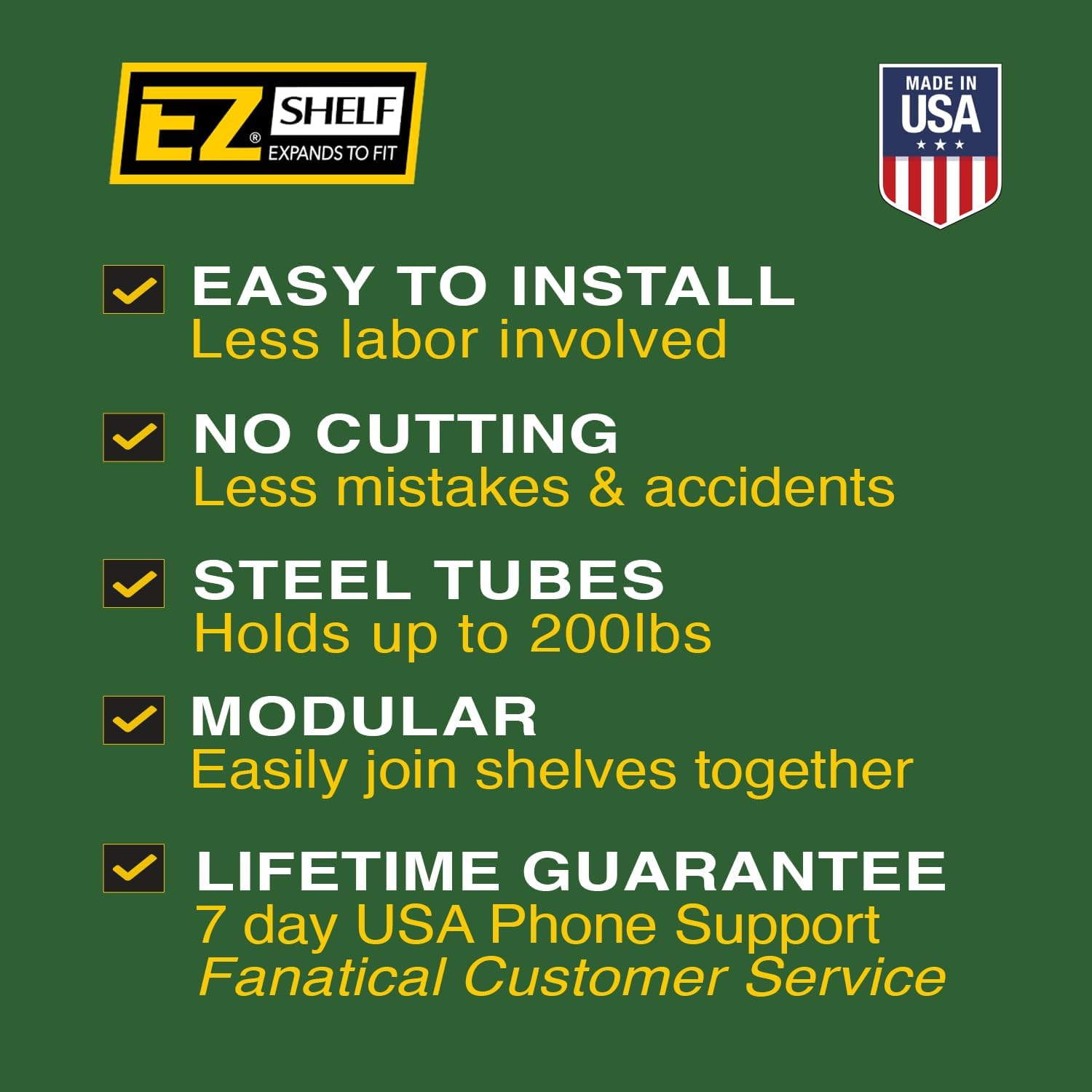 - Closet Organizer System Includes: 6 Strong Expandable Steel Tubes, Left and Right Tube Receiver, No-Drill Anchors and Screws and EZ Shelf Magnetic Level, No Center Support