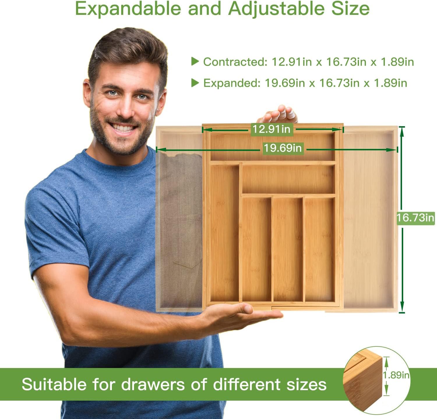 - Expandable and Adjustable Utensil Organizer: Designed with 6-8 compartments, the silverware organizer can save space while accommodating multiple items, which is expandable from 13 inches to 19.6 inches wide with smooth sliding.