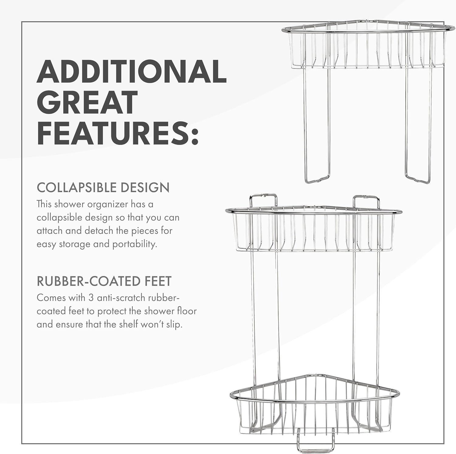 - Rust-Proof Shower Caddy: This corner shower caddy is made from high-quality, rust-free stainless steel with anti-scratch, rubber-coated feet
