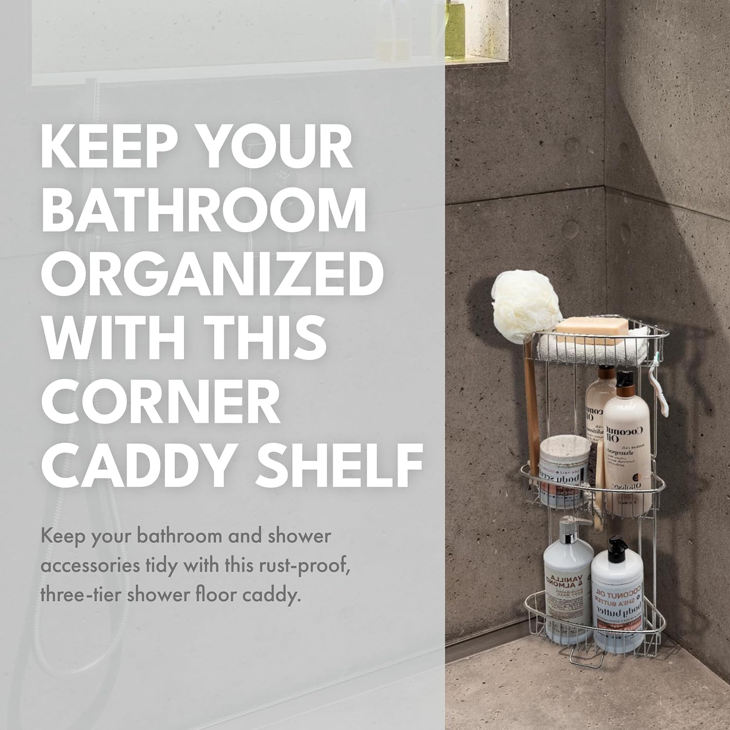 - Stainless Steel Shower Caddy: Keep your bathroom and shower accessories tidy with this rust-proof, three-tier shower floor caddy