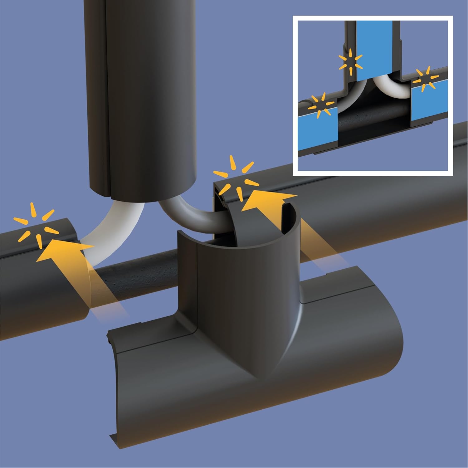 - Bends and Tees have rear grip tabs for simple clip-over fitting enabling easy installations and forgiving any imprecise cuts or measurements.