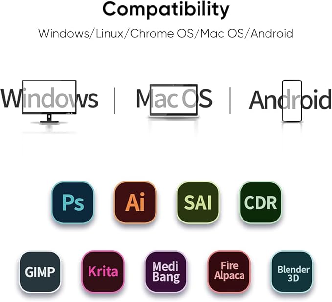 - Versatile Compatibility: The Deco 01 V3 is compatible with a wide range of operating systems, including Windows 7 and later, Android 10.0 and above, macOS 10.13 and newer, Chrome OS 88 and later, as well as Linux. It also works with popular design software such as Photoshop, Corel Painter, Illustrator, and Clip Studio. *Ensure your Windows is updated to version 11 or your Mac to version 12 for optimal performance