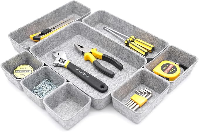 - 【Package content】8-piece desk drawer organizer trays, high-quality premium felt gray colors storage bins, outer gray, inner high premium charcoal color. Elevate your everyday organization, decluttering, and sorting your home office in clean, tidy, quiet, joyful surroundings, with a relaxed, sleek, minimal lifestyle.