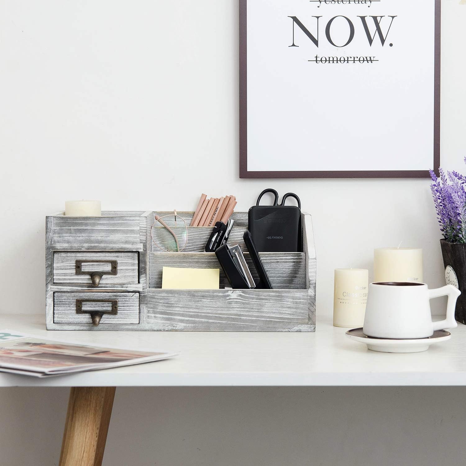 Distressed Rustic Wooden Office Desktop Organizer Wood Shelf Tabletop Home Organizer Storage with Multiple Compartments 2 Tier Drawers,perfect Jewelry storage Display Box for Desk, Vanity (gray)