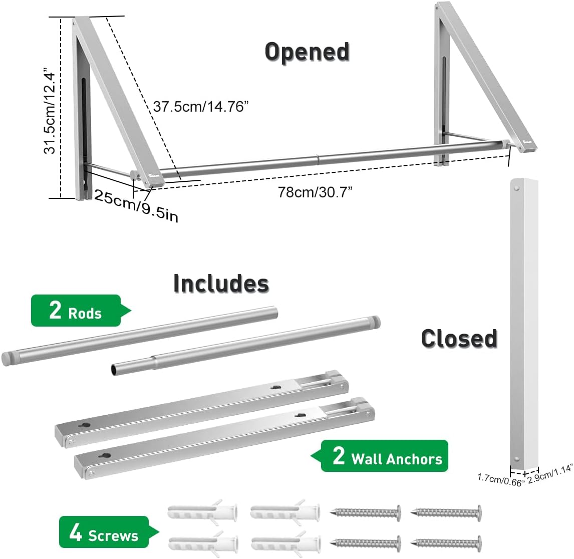 - This wall hanger is made of high quality aluminum, non-corrodable, a good small item lightweight but sturdy and durable. Open size: approx. 32 x 29 x 3 cm (L x W x H); Closed size: approx. 37.3 x 3 x 1.8 cm (L x W x H). Shaft length: 82 cm