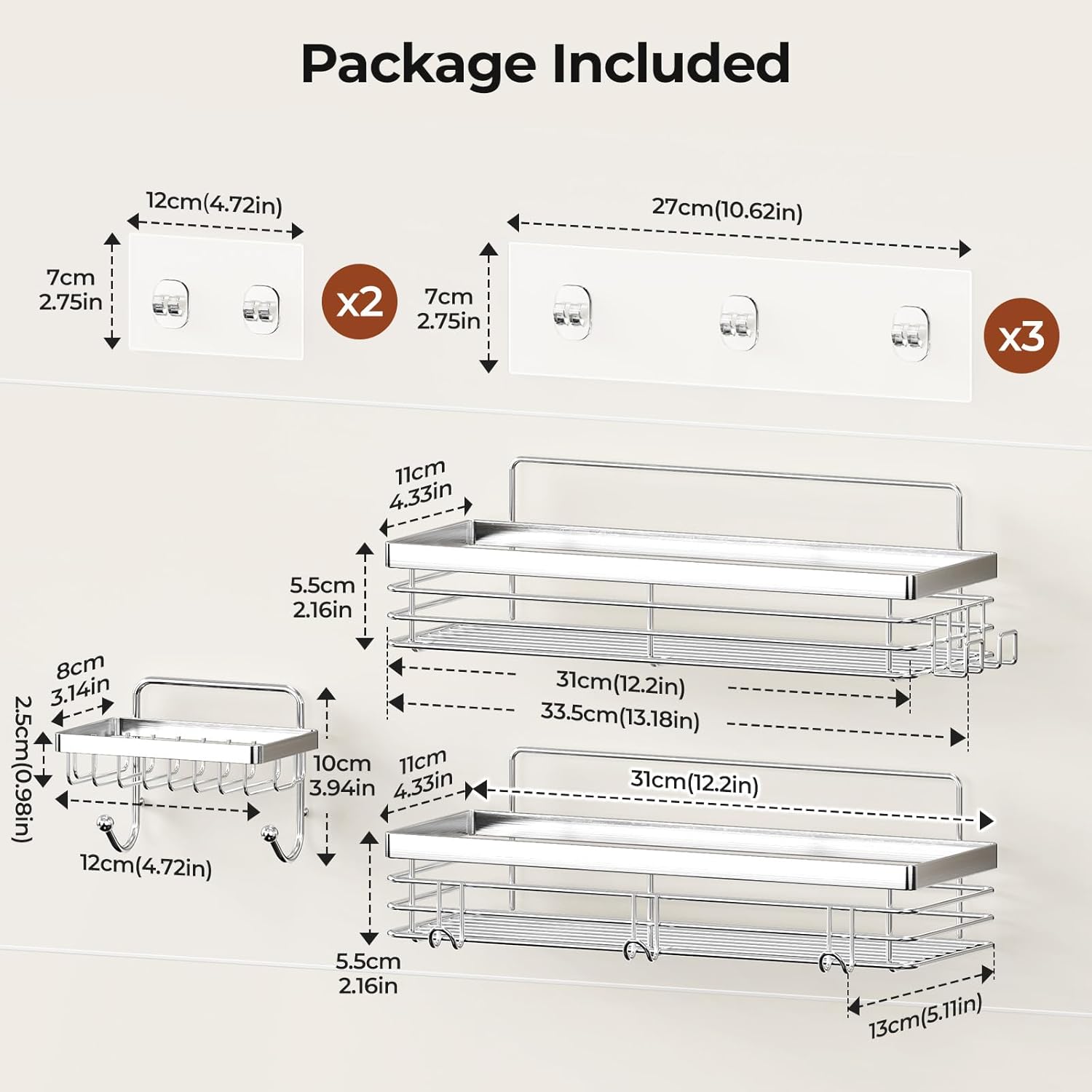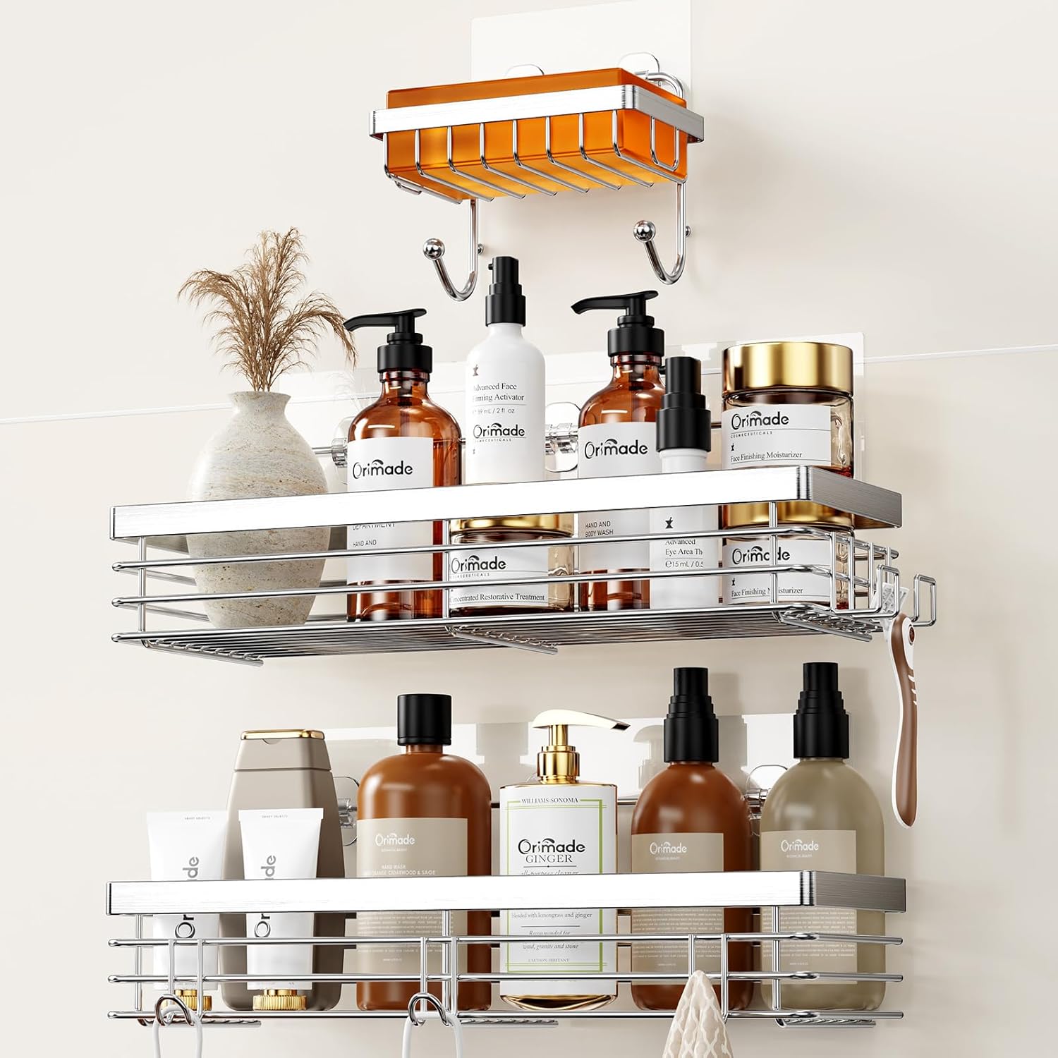 Orimade Adhesive Shower Caddy Soap Dish Holder Shelf with 5 Hooks Bathroom Organizer Basket Kitchen Storage Rack Wall Mounted No Drilling Stainless Steel - 3 Pack,Silver