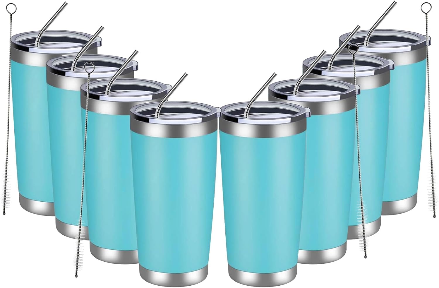 MEWAY 20oz Tumbler 8 Pack Double Wall Vacuum Insulated Travel Mug Bulk, Stainless Steel Tumblers with Lid and Straw, Durable Powder Coated Coffee Cups for Cold & Hot Drinks (Light Blue, 8)
