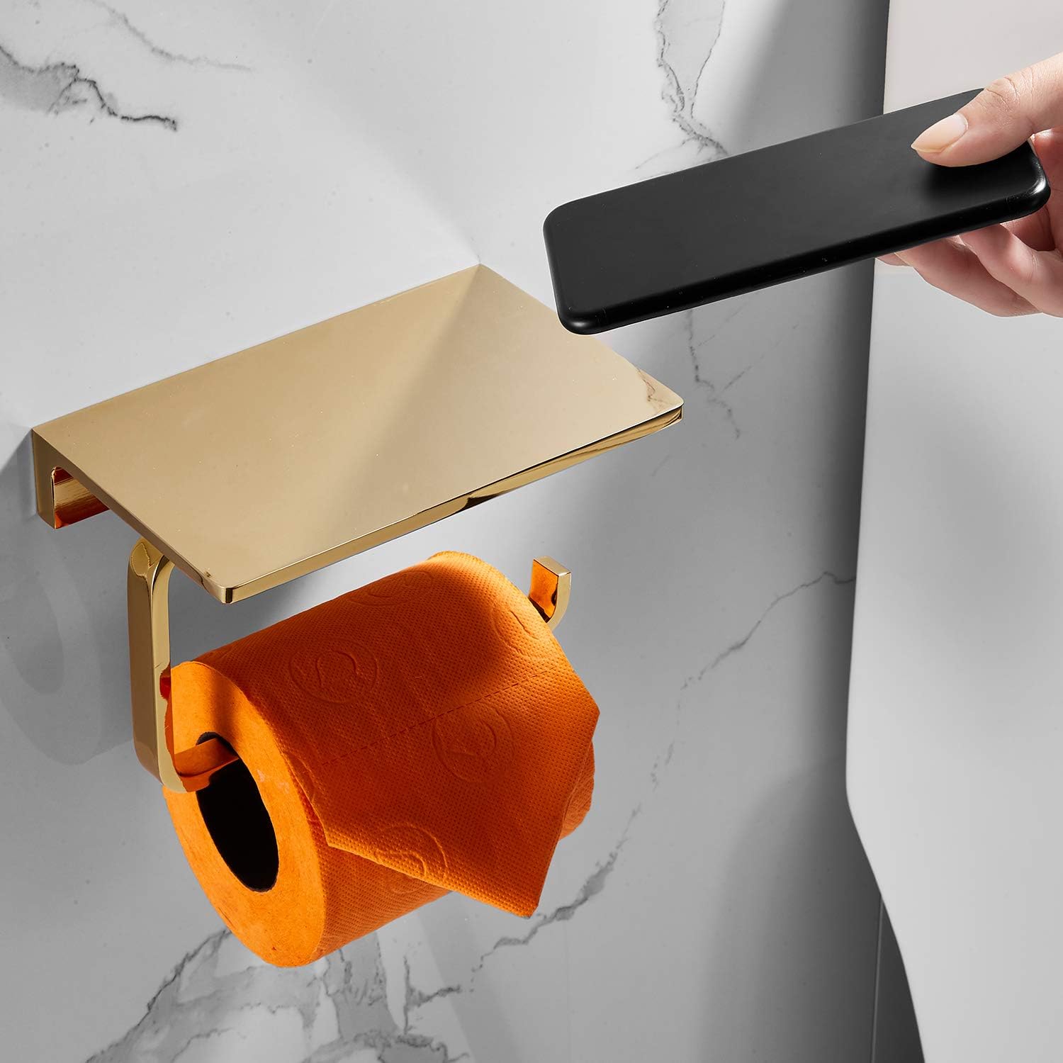 Toilet Paper Holder for Bathroom Solid Brass and Superior Hotel Style Tissue Roll Holder with Cell Phone Storage Gold Finish