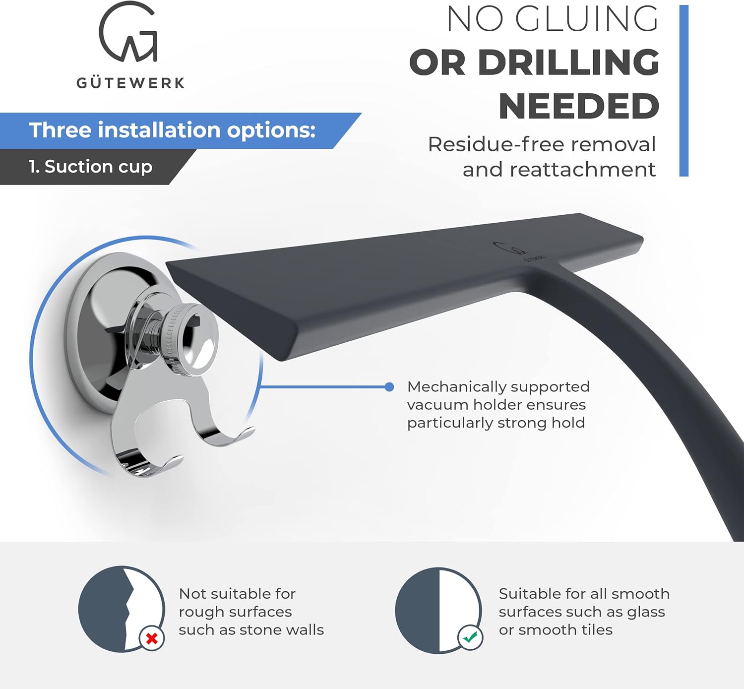 - SUPER STRONG SUCTION HOOK - No drilling or gluing required! You can easily remove and reattach the squeegee stainless steel hook to smooth surfaces such as panes, tiles, shower walls, shower glass surfaces, doors, cubicles, and enclosures.