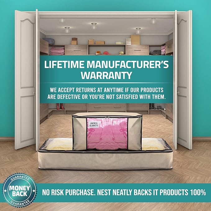 - THE NEATEST WARRANTY – At NestNeatly, we promise that our clothes storage bags, set of 3 helps keep the clutter away for years to come. You’re sure to have many years of organization—the containers come with a lifetime manufacturer’s warranty!
